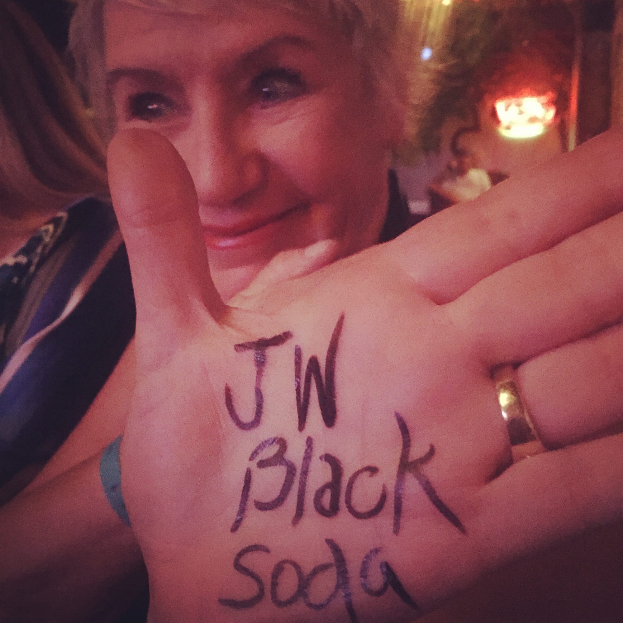 When we arrived, Nan attempted to shout her drink order of scotch and soda, and the bartender instead served her something with cranberry juice. To prevent further confusion, she obtained a Sharpie — not sure how she found a Sharpie, but her friend Sally had dinner rolls in her purse, so anything is possible — and wrote her drink order on her hand. “I tipped him 20 bucks, and he took great care of us for the rest of the night,” Nan says.
