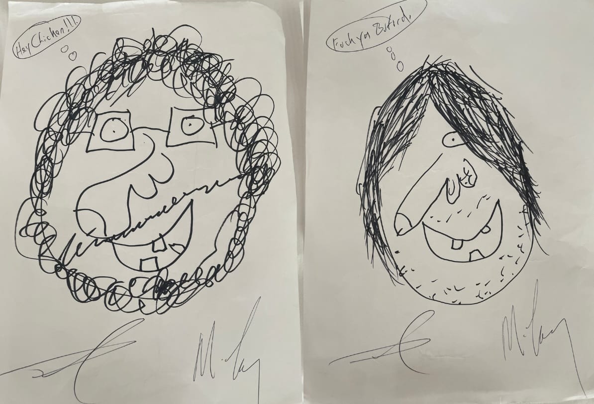 The show in Hamburg was 5/31/22 at this venue called Logo, and the stage was probably 12 inches high. It was so intimate. There were these support beams on stage, so it made it very awkward for the band to move around. Instead of being separated by the support beam and not being able to see Patterson, Cooley drew a picture of Patterson and taped it to a beam so that he could see Patterson's face. And he did the same thing on the other side so that Patterson could see him. But instead of noses, it's penises, so they both have dick faces. I didn't realize it at first, but it’s very clear once you see it.
